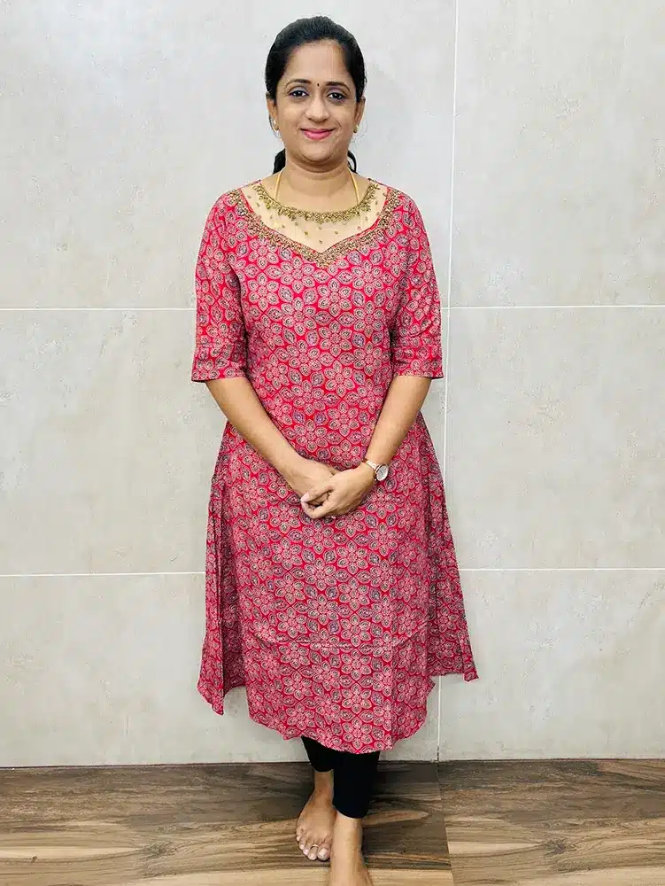 Ajrakh cotton kurti with transparent handworked net yoke(Aline pattern)