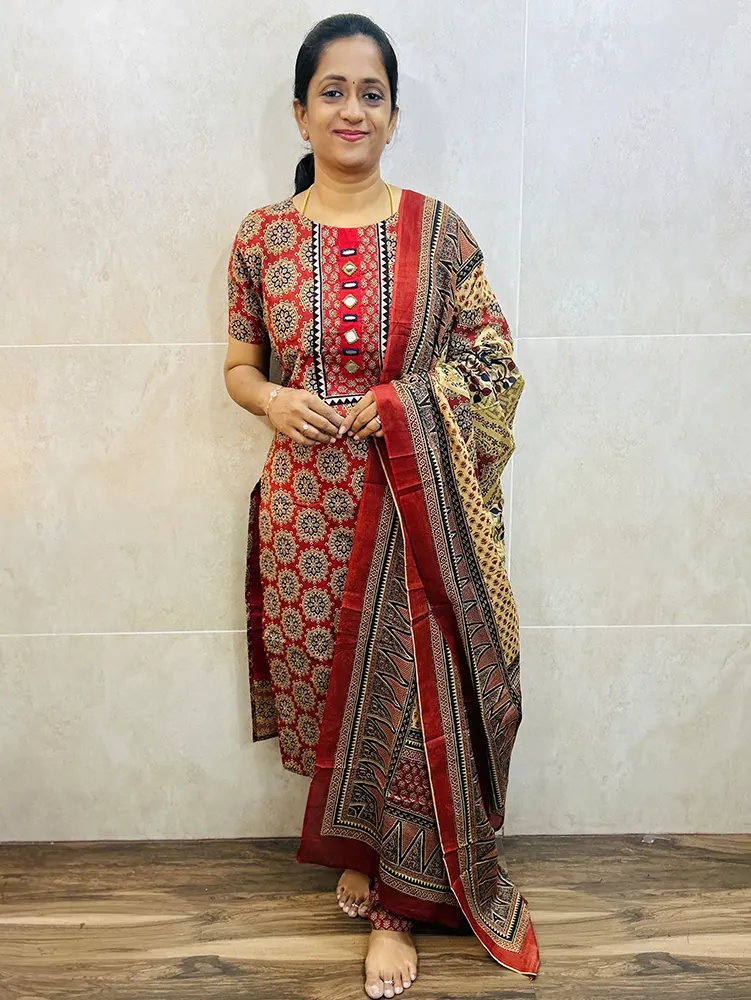 Patteren 1 – Red – Ajrakh cotton top (cotton lining) with jaipuri handwork in yoke paired with cotton dupatta and cotton bottom (free size)
