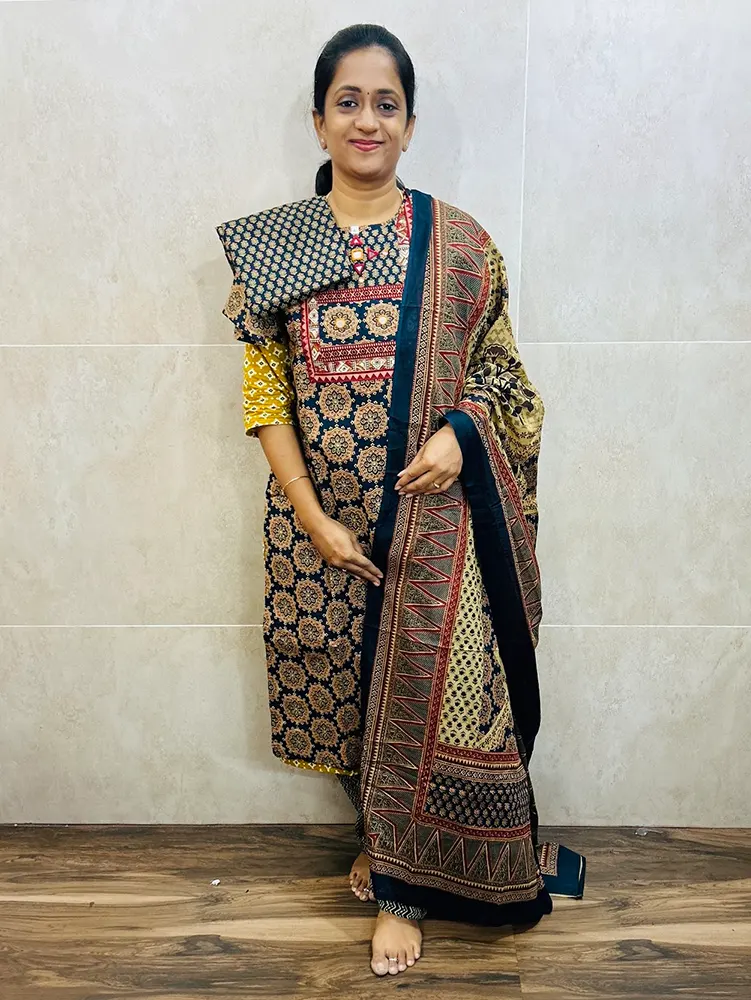 Patteren 2 – Blue – Ajrakh cotton top (cotton lining) with jaipuri handwork in yoke paired with cotton dupatta and cotton bottom (free size)