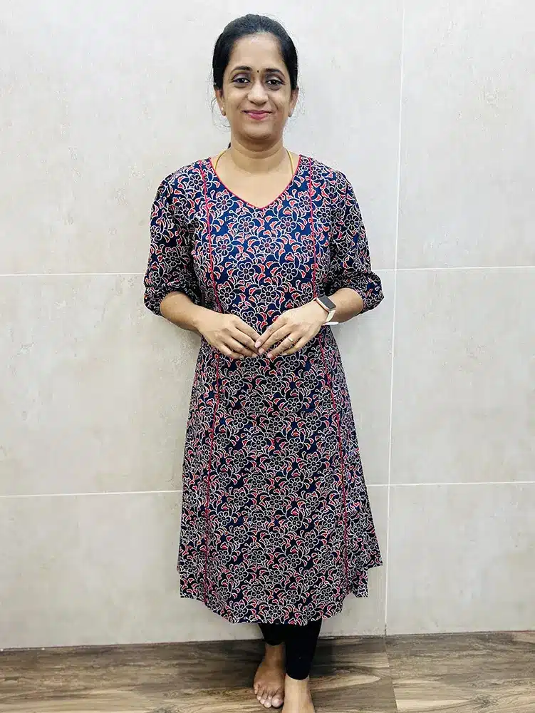 Ajrakh printed cotton top (cotton lining) with allover piping work and elastic sleeves (Aline Panelcut)