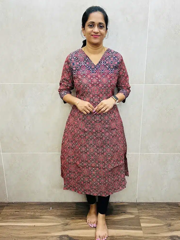 Maroon – Ajrakh printed cotton top (cotton lining) with mirror work on yoke (Aline pattern)
