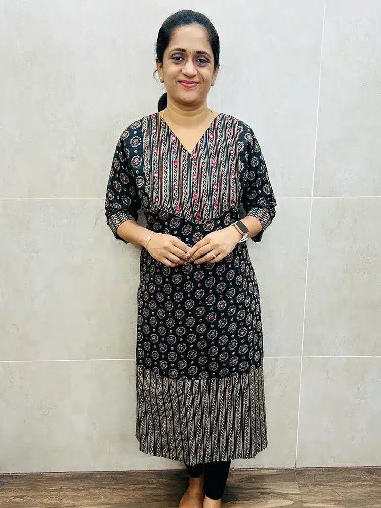 Black – Ajrakh printed cotton top (cotton lining) with mirrorworked yoke (Aline Anarkali pattern)