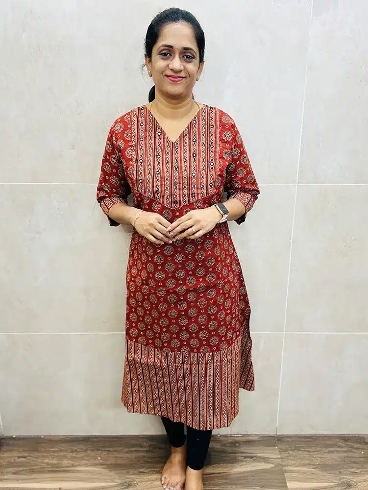 Brick red – Ajrakh printed cotton top (cotton lining) with mirrorworked yoke (Aline Anarkali pattern)