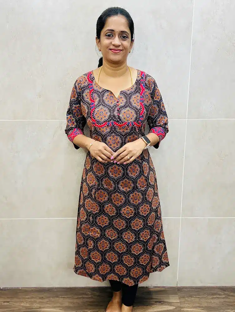 Dark Grey – Ajrakh printed cotton top with Potli work on yoke (Aline pattern)