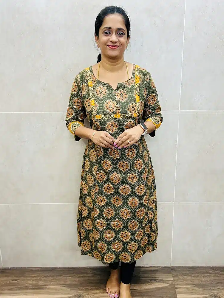 Mehandi Green – Ajrakh printed cotton top with Potli work on yoke (Aline pattern)