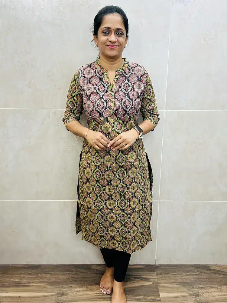 Green – Ajrakh printed Jaipur Kantha cotton top (cotton lining) with fancy buttons on yoke (straight cut)