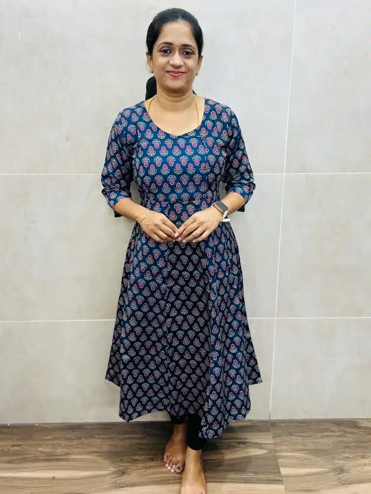 (Blue)Ajrakh printed soft Cotton rayon(cotton lining)top with fancy buttons on yoke(Panel cut Anarkali)