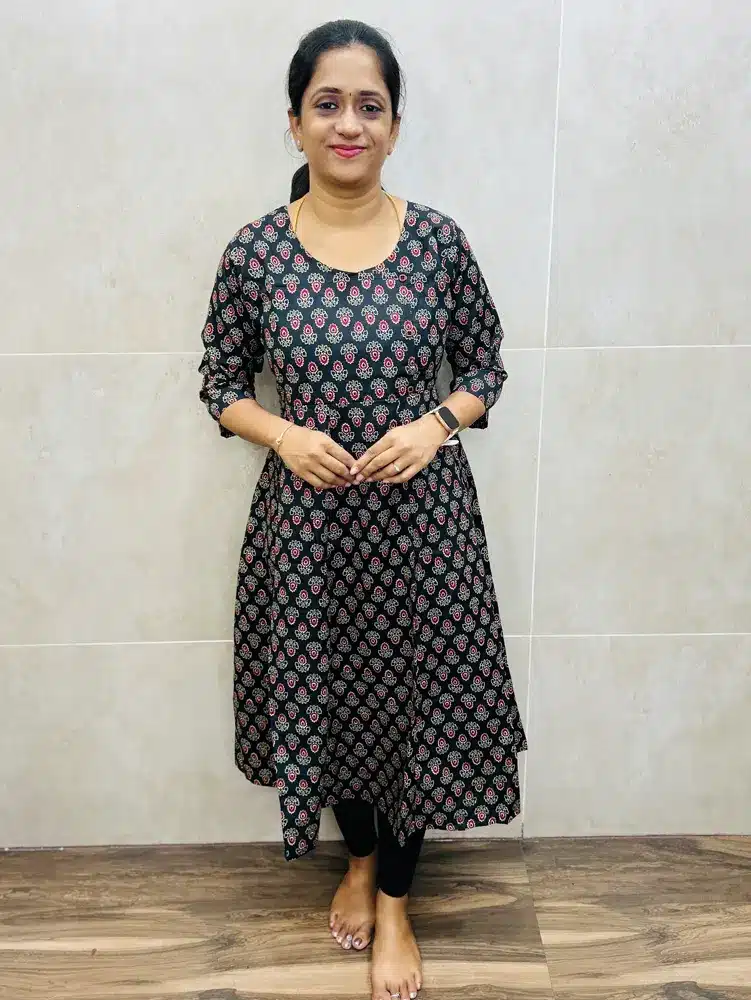 (Black)Ajrakh printed soft Cotton rayon(cotton lining)top with fancy buttons on yoke(Panel cut Anarkali)