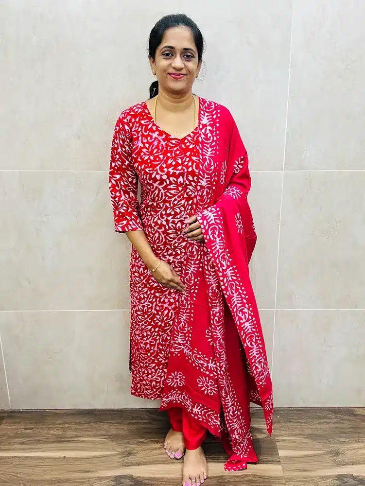 Red – Batik printed rayon top paired with printed rayon dupatta and rayon bottom (straight cut)
