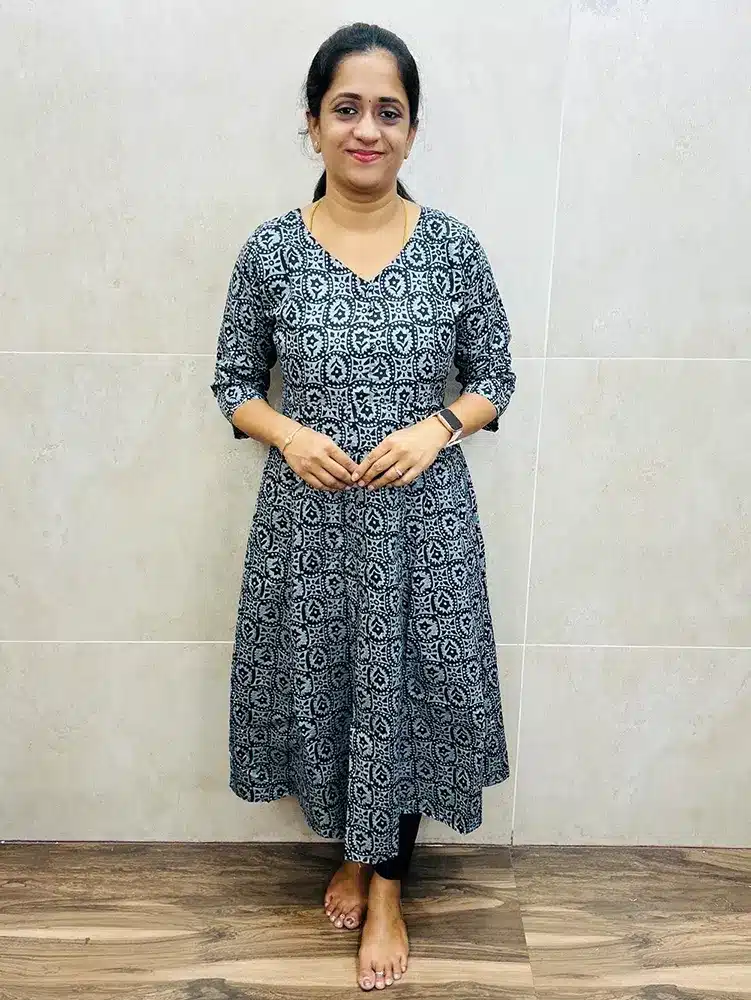 Batik printed soft silk top (cotton lining) with Potli work on yoke (Anarkali pattern)