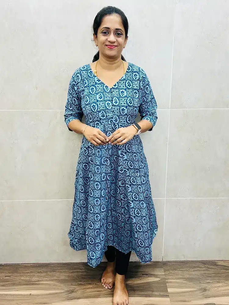 Batik printed soft silk top (cotton lining) with Potli work on yoke (Anarkali pattern)