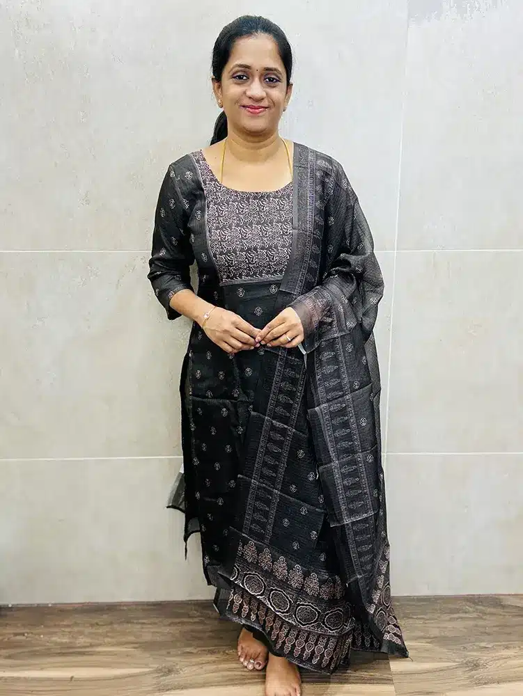 Olive green – Block printed Kota top (full crepe lining) paired with printed Kota dupatta and silk bottom (straight cut)