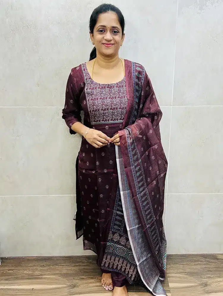 Maroon – Block printed Kota top (full crepe lining) paired with printed Kota dupatta and silk bottom (straight cut)