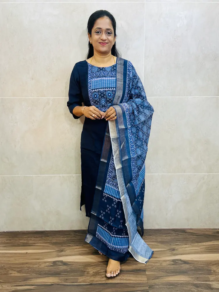 (Blue)Soft linen cotton top(full crepe lining) with printed patchwork on yoke paired with printed linen cotton dupatta and silk bottom(straight cut)