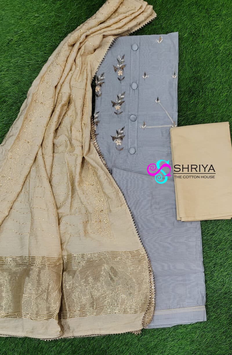 Chanderi silk top with a beautiful embroidery paired with a Embroidered soft silk dupatta and contrast cotton bottom