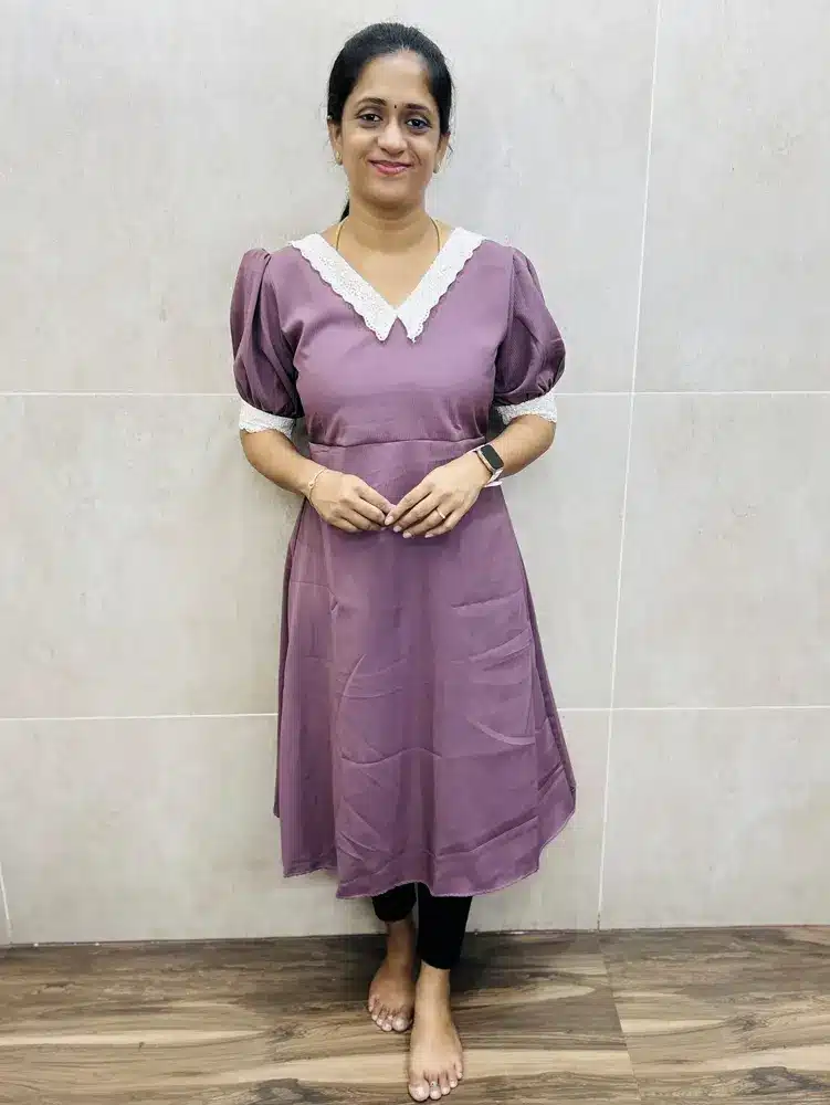 (Light Purple)Imported stretchable Rayon top with crochet lace work on neck and sleeves(Gown pattern)