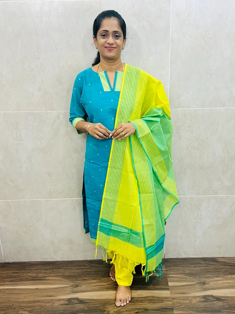 Pure handloom cotton top (cotton lining) with allover thread weaving paired with cotton dupatta and cotton bottom (free size)