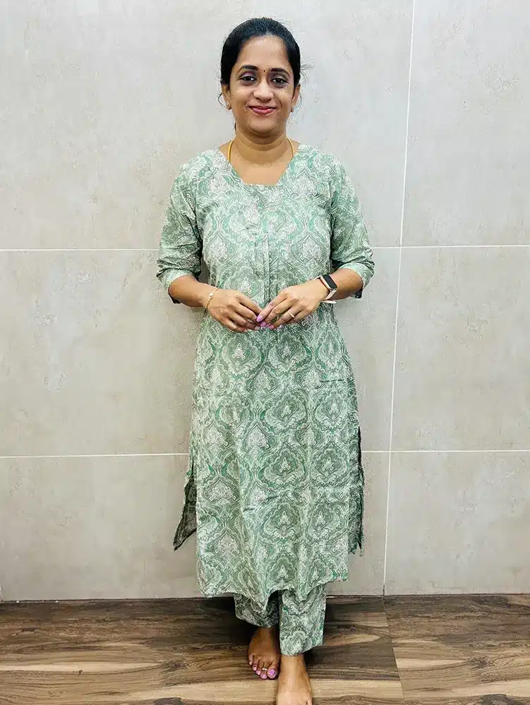 Green – Printed cotton top with pleated work paired with printed cotton bottom (straight cut)