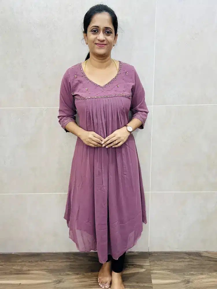 Printed soft Jaipur cotton top (cotton lining) with potli work on yoke paired with printed cotton bottomFaux Georgette top(crepe lining including sleeves)with elegant handwork on yoke and pleated flare(Aline pattern)(straight cut)