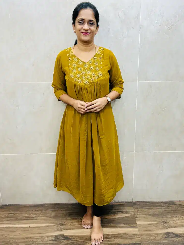 Faux Georgette top(crepe lining)with a beautiful embroidered handworked yoke and pleated flare(Aline pattern)