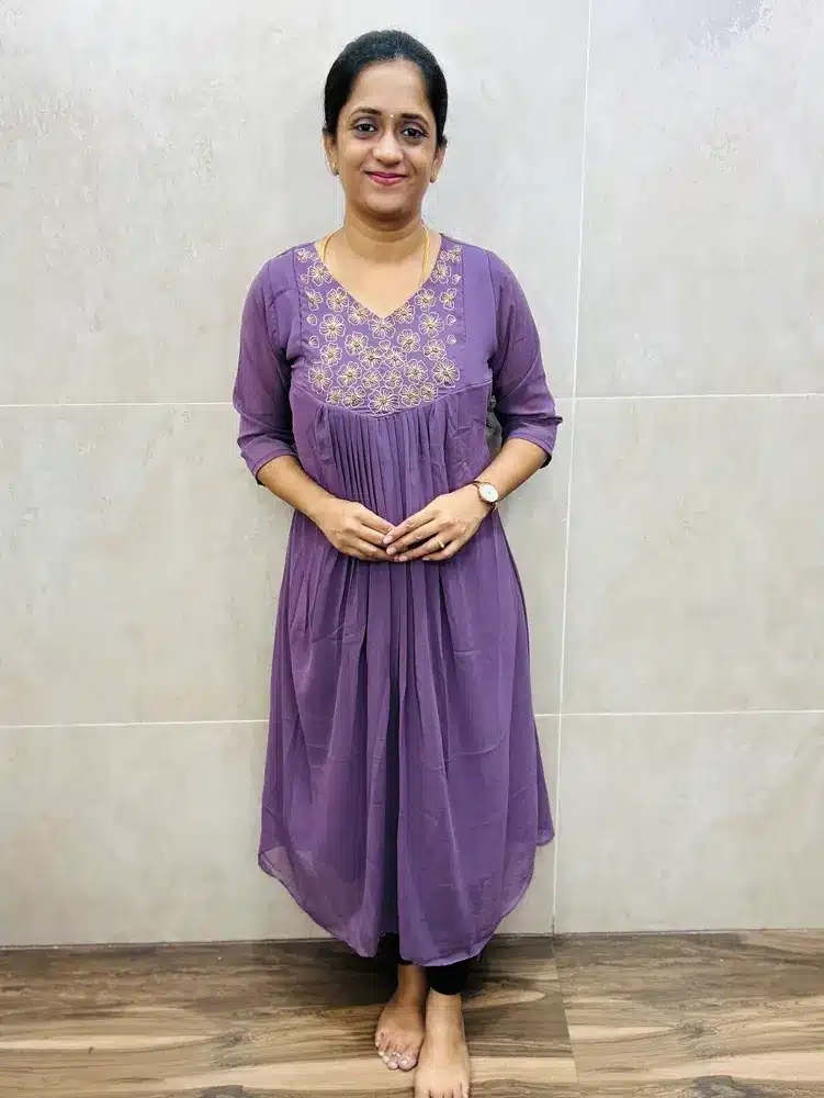 Faux Georgette top(crepe lining)with a beautiful embroidered handworked yoke and pleated flare(Aline pattern)