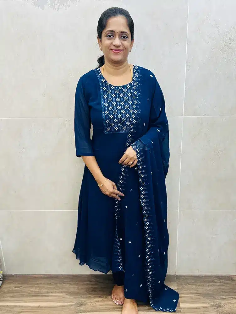 Navy blue – Georgette top (crepe lining) with embroidered yoke paired with embroidered Georgette dupatta and silk bottom (straight cut)