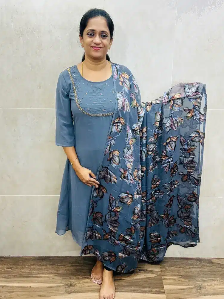 (Cement grey)Georgette top(full crepe lining)with handworked yoke paired with Georgette brasso dupatta