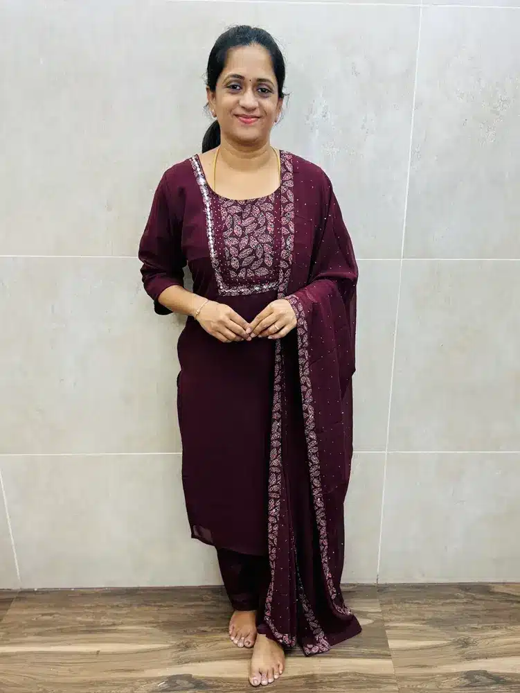(Maroon)Georgette top(full crepe lining)with mirror worked yoke paired with Georgette dupatta and silk bottom(straight cut)