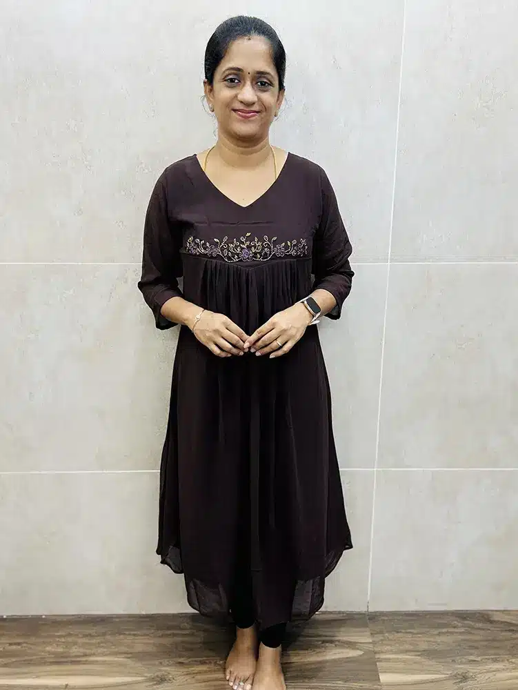 Dark Chocolate brown – Georgette top (crepe lining) with pleated flare and handworked yoke (Aline pattern)
