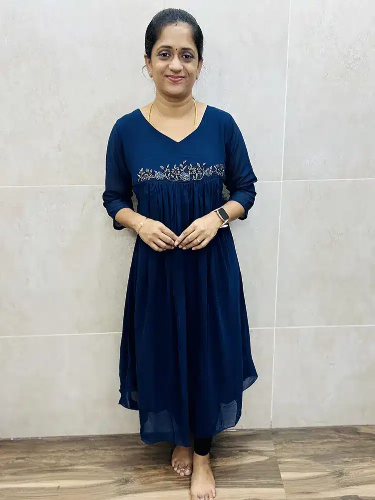 Navy Blue – Georgette top (crepe lining) with pleated flare and handworked yoke (Aline pattern)
