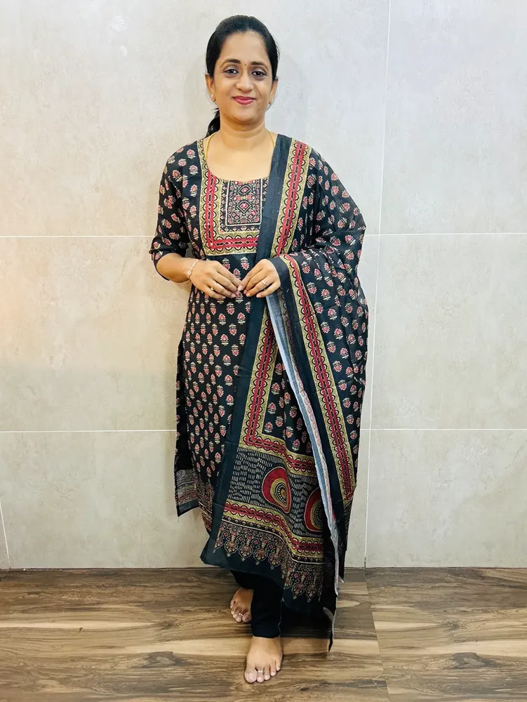 Handblock printed dola silk top(cotton lining) paired with printed soft chanderi silk dupatta and santoon bottom(free size)