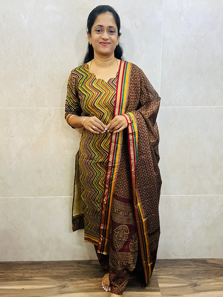 Handblock printed Mangalagiri cotton top (cotton lining) paired with printed Mangalagiri cotton dupatta and cotton bottom (free size)