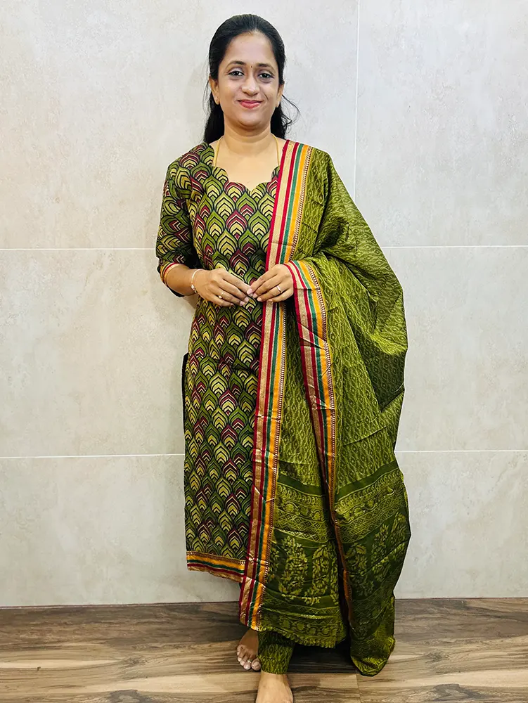 Handblock printed Mangalagiri cotton top (cotton lining) paired with printed Mangalagiri cotton dupatta and cotton bottom (free size)