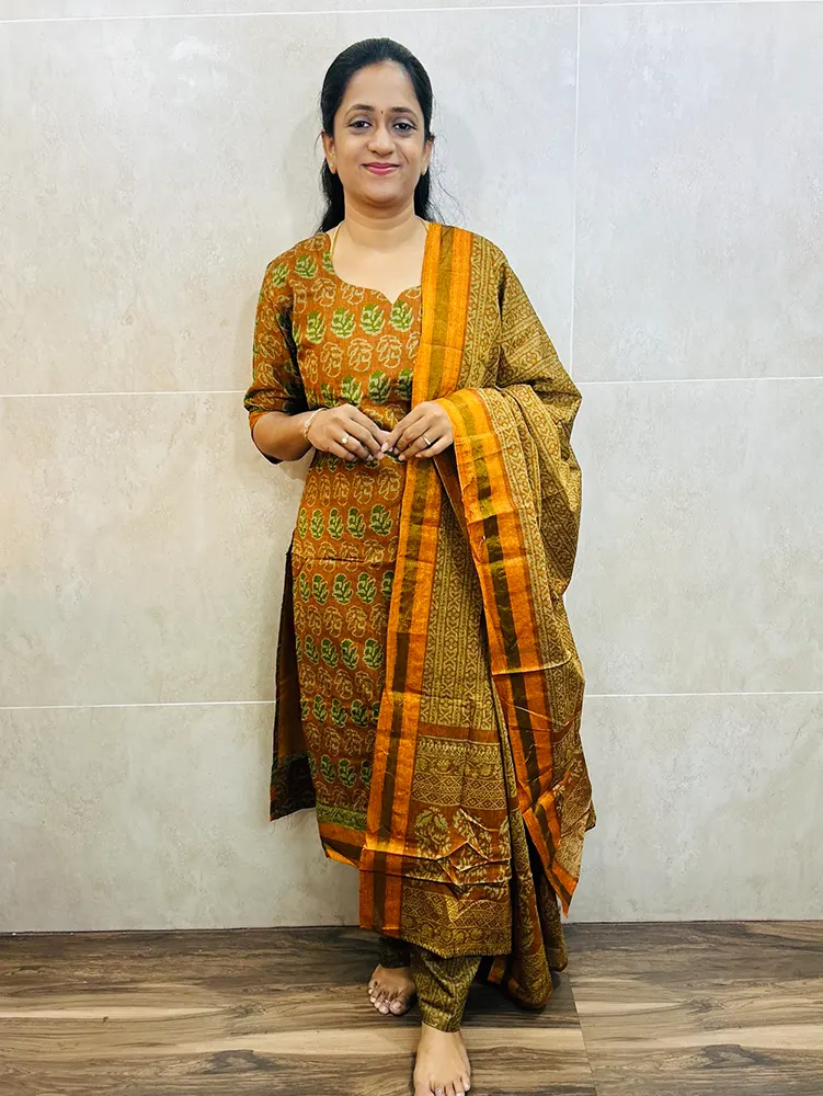 Handblock printed Mangalagiri cotton top (cotton lining) paired with printed Mangalagiri cotton dupatta and cotton bottom (free size)