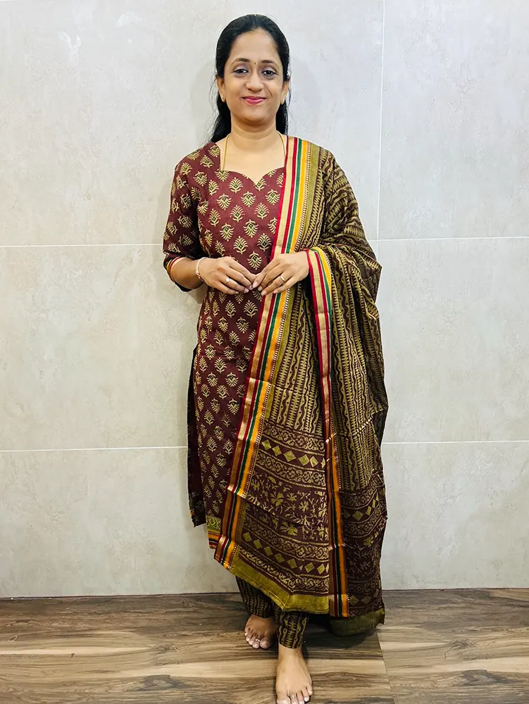 Handblock printed Mangalagiri cotton top (cotton lining) paired with printed Mangalagiri cotton dupatta and cotton bottom (free size)