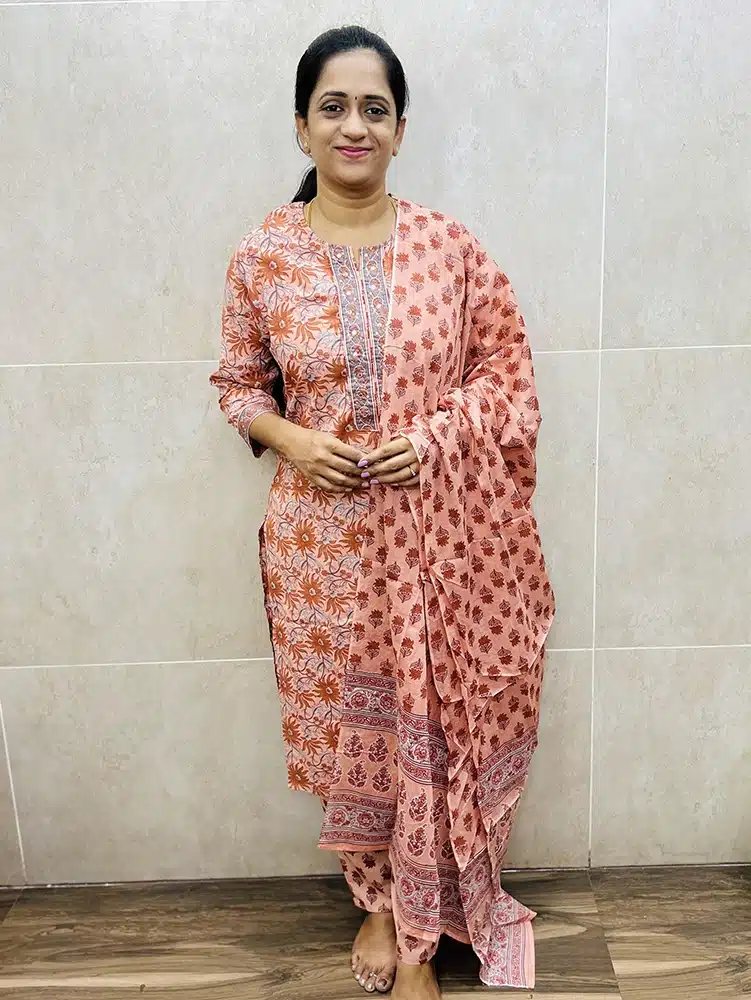 Handblock printed pure Jaipur cotton top with printed cotton dupatta and printed cotton bottom (1-side pocket)