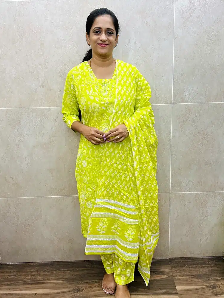 Handblock printed pure Jaipur cotton top with printed cotton dupatta and printed cotton bottom (1-side pocket)