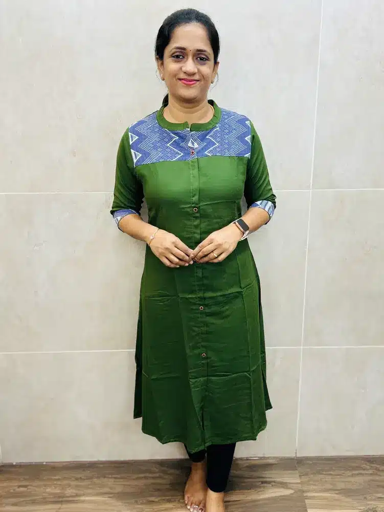 Light green – Imported stretchable Rayon top (crepe lining) with textured Rayon patchwork on yoke and all over fancy buttons (Aline pattern)