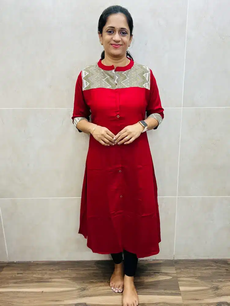 Red – Imported stretchable Rayon top (crepe lining) with textured Rayon patchwork on yoke and all over fancy buttons (Aline pattern)
