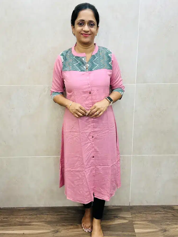 Pink – Imported stretchable Rayon top (crepe lining) with textured Rayon patchwork on yoke and all over fancy buttons (Aline pattern)