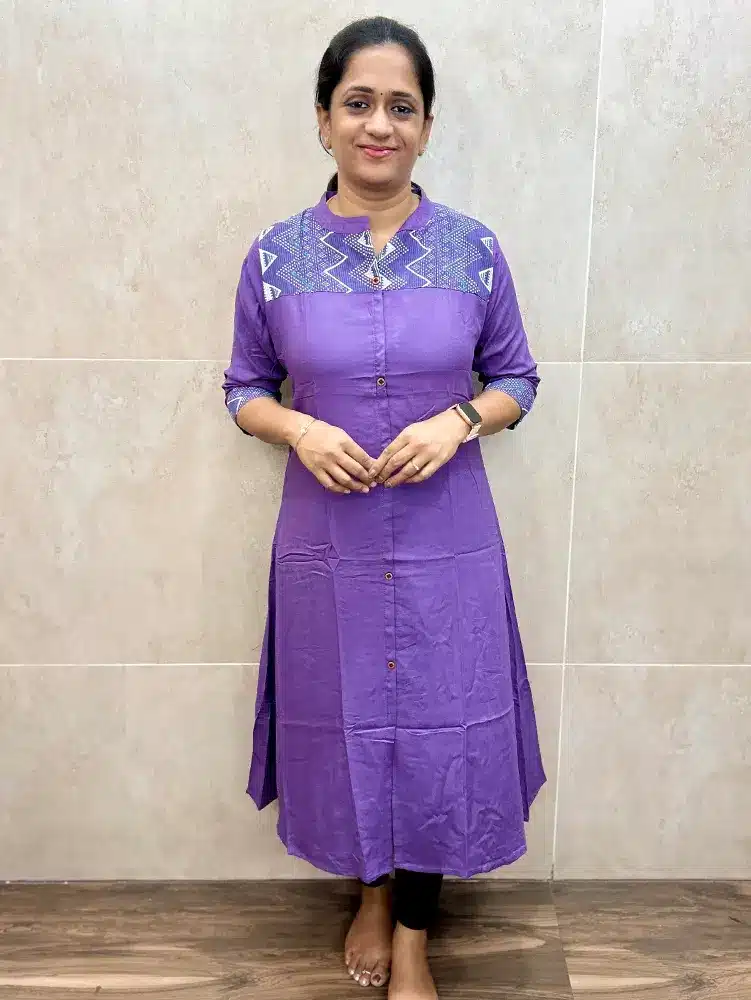 Purple – Imported stretchable Rayon top (crepe lining) with textured Rayon patchwork on yoke and all over fancy buttons (Aline pattern)