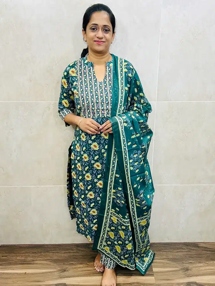 Jaipur cotton top (cotton lining) with handworked yoke paired with printed cotton dupatta and cotton bottom (straight cut)