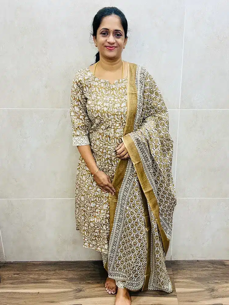 Printed Jaipur cotton top (cotton lining) with 2-side pockets with Pintuck pattern paired with printed cotton dupatta and cotton bottom (straight cut)