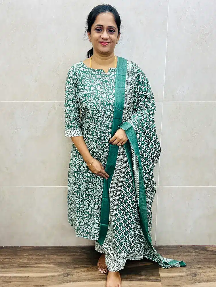 Printed Jaipur cotton top (cotton lining) with 2-side pockets with Pintuck pattern paired with printed cotton dupatta and cotton bottom (straight cut)
