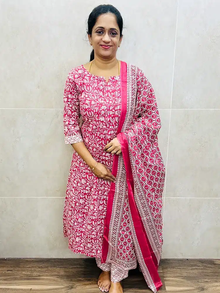 Printed Jaipur cotton top (cotton lining) with 2-side pockets with Pintuck pattern paired with printed cotton dupatta and cotton bottom (straight cut)