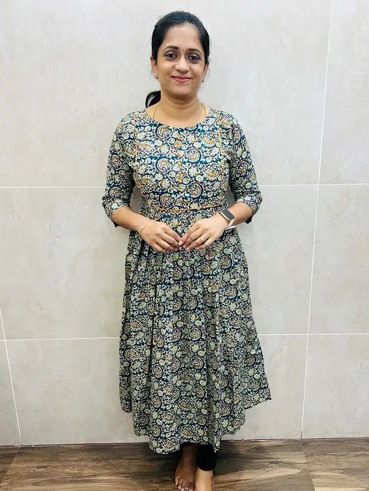 Blue – Kalamkari cotton top (cotton lining) with potli work on yoke and pleated flare (Aline pattern)