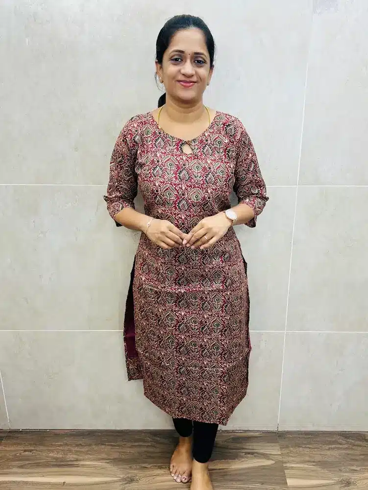 (Maroon)kalamkari printed soft silk top(cotton lining) with fancy button in yoke(straight cut)