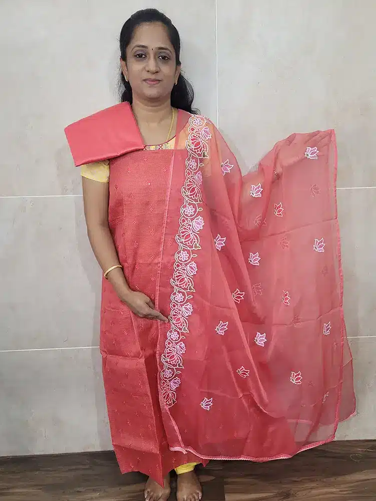 Most of our cotton salwar suits, measurement of the top will be 2.5 meters, dupatta will be from 2.2 to 2.5 meters and bottom will be 2 meters. If you have measurement constraint, please check with us through whatsapp (9176641794) prior booking.
