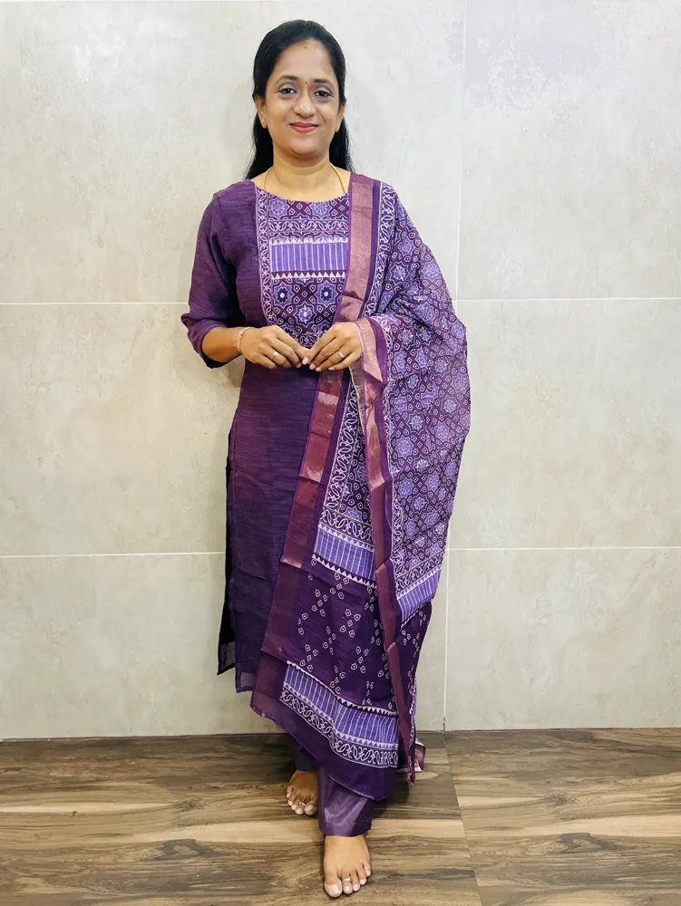 (Light purple)Soft linen cotton top(full crepe lining) with printed patchwork on yoke paired with printed linen cotton dupatta and silk bottom(straight cut)