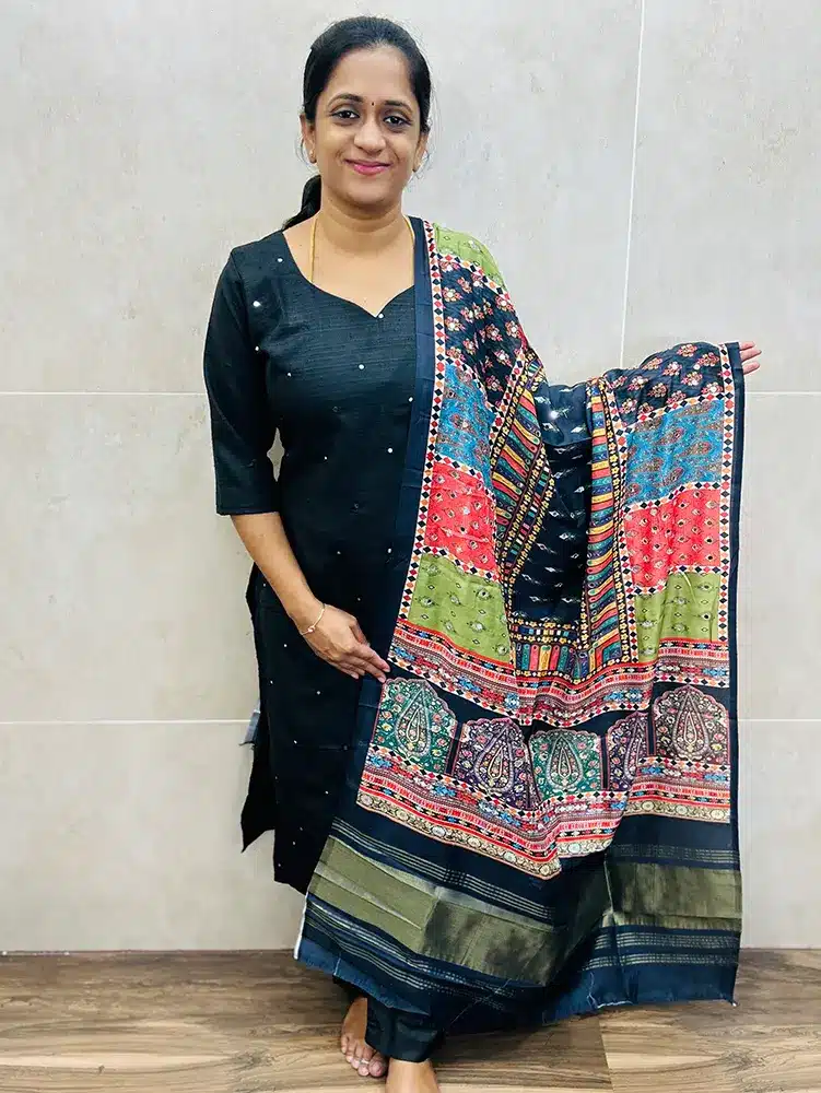 Premium linen cotton top (full crepe lining) paired with mirror worked muslin silk dupatta and silk bottom (straight cut)